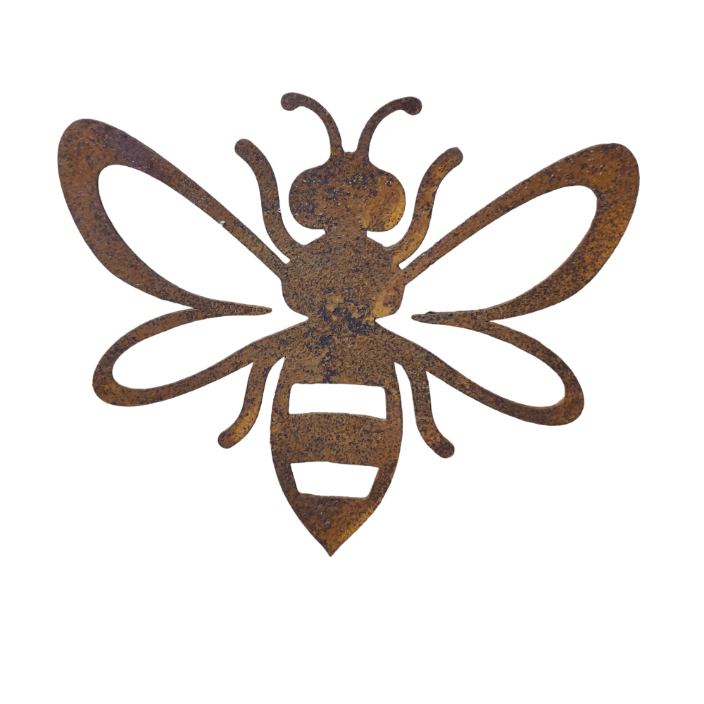 Een bij gemaakt van metaal. Het metaal is al behandeld waardoor het al een roesteffect heeft. Door weersomstandigheden zal de bij alleen maar mooier gaan kleuren.
