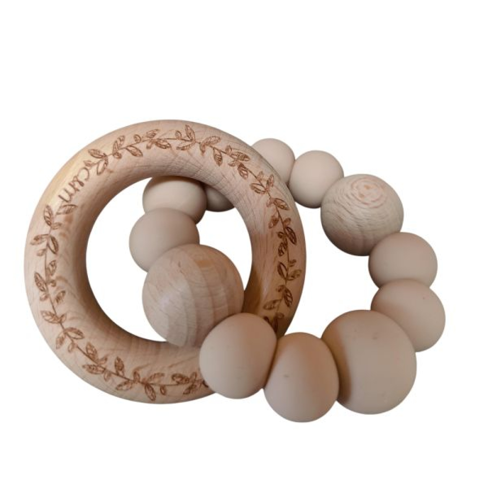 Een hangemaakte rammelaar/ bijtring. De ring gemaakt van beukenhout is volledig gegraveerd met een prachtig bladmotief. Als deze ring tegen één van de 2 houten kralen aan komt geeft dit een zacht rammelend geluid.