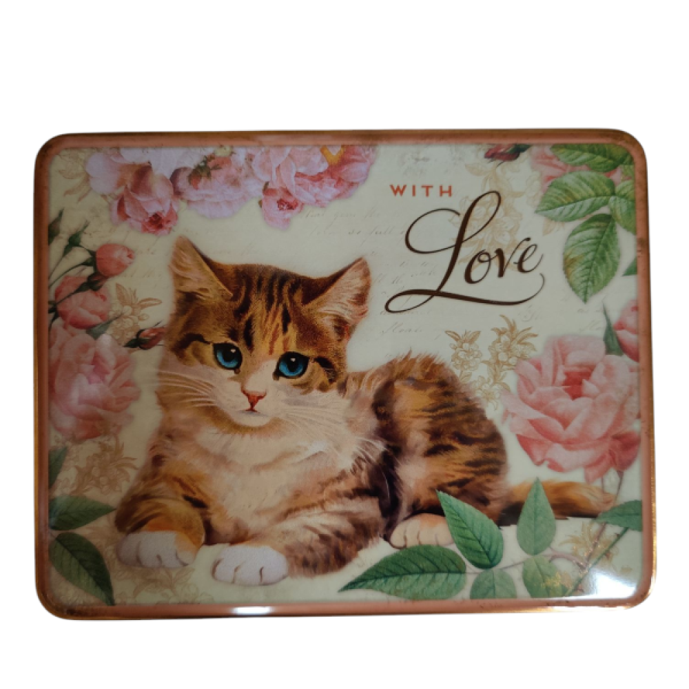 Een blikje met de afbeelding van een kat met hieronder de tekst 'with love', leuk om bijvoorbeeld koekjes te bewaren.