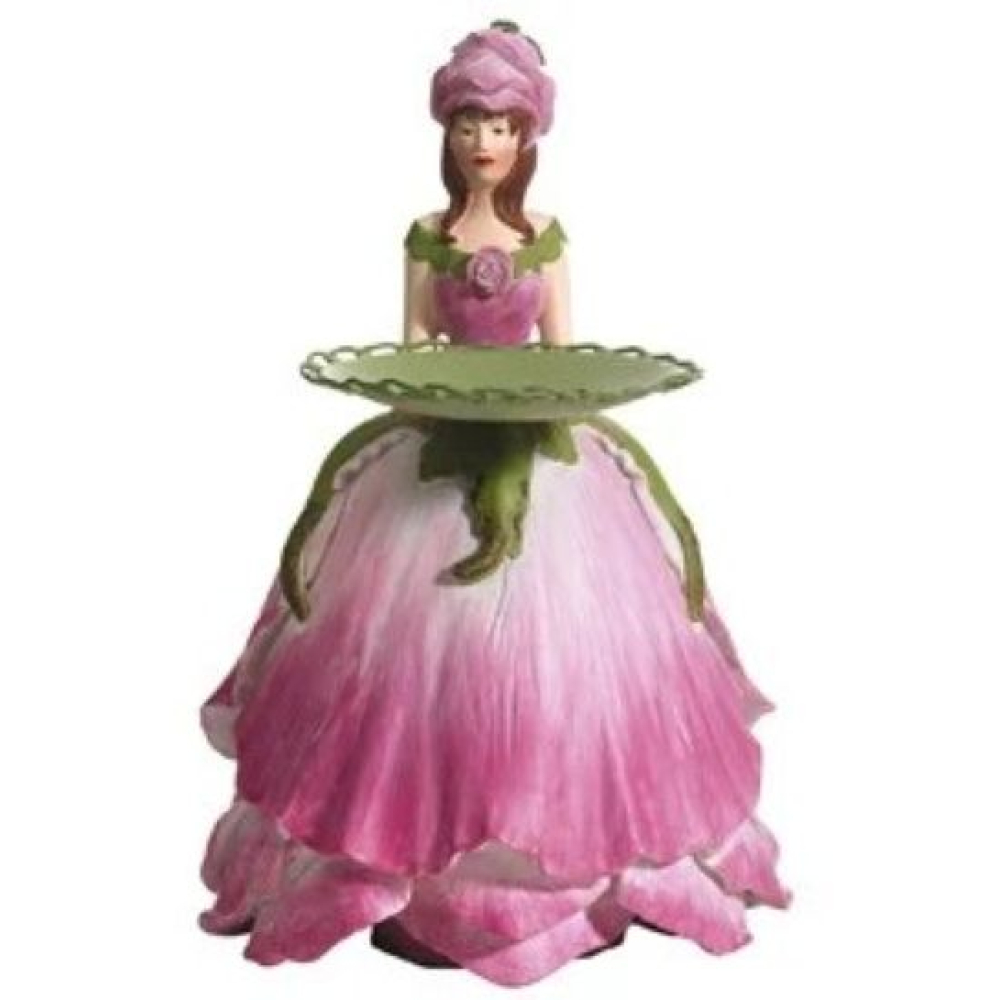 Een prachtig rozen meisje dat een dienblad vasthoudt welk je kunt gebruiken als waxinehouder.