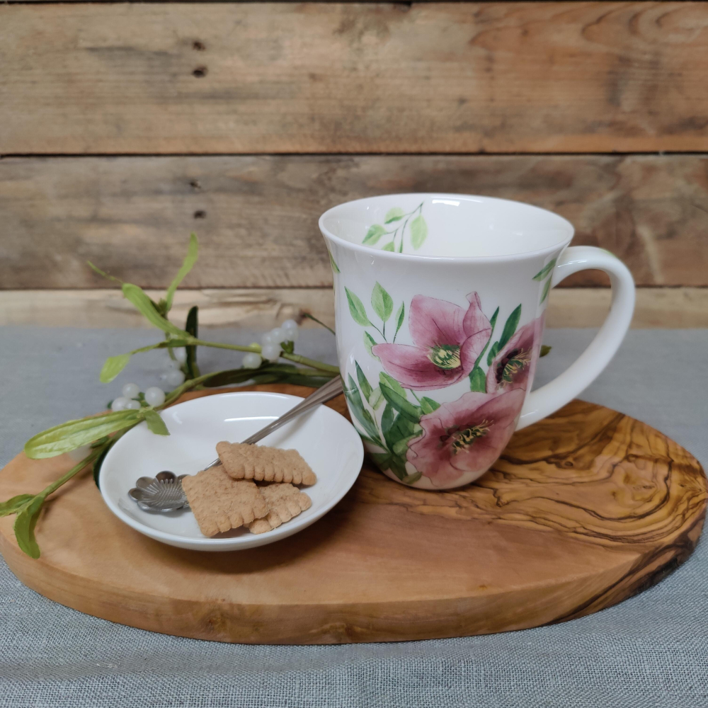 Vrolijke beker met de afbeelding van helleborus bloemen, gemaakt van fine bone china. De porseleinen beker is vaatwassermachine bestendig.