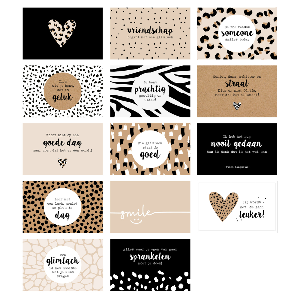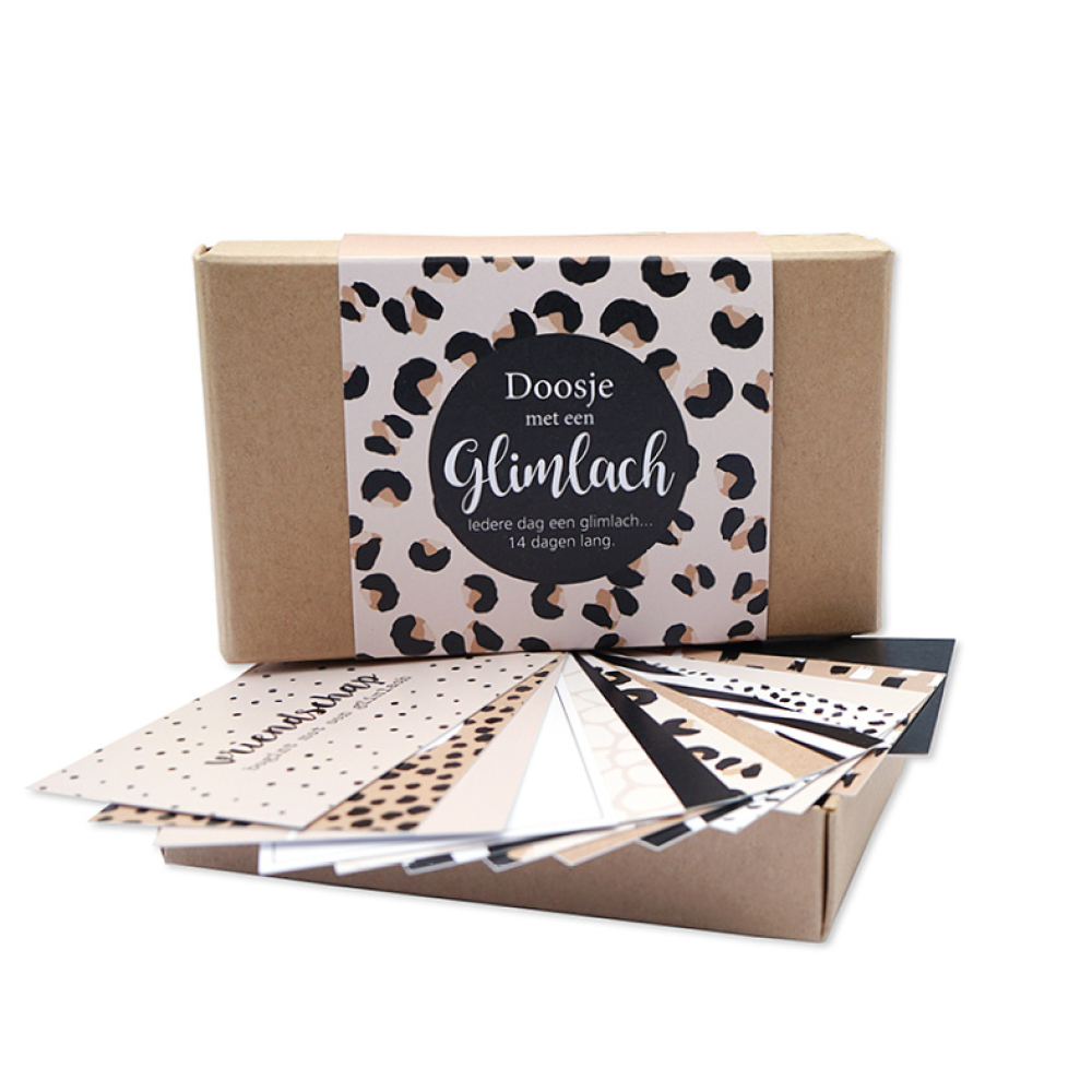 Doosje met een Glimlach... de naam verraadt de inhoud al... hier krijg je een glimlach van op je gezicht. Een leuk formaat kraft doosje met hierin 14 enkele visitekaartjes (85x55cm) met uitspraken waar je vrolijk van wordt. Om het doosje zit een leuke sleeve welke je kan blijven gebruiken, doordat je deze er makkelijk af kunt schuiven. Deze doosjes zijn super leuk om te geven en nog leuker om te krijgen! De achterzijde van de kaartjes zijn geschikt om iets op te schrijven.
