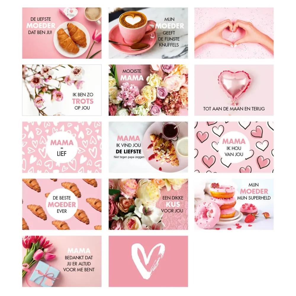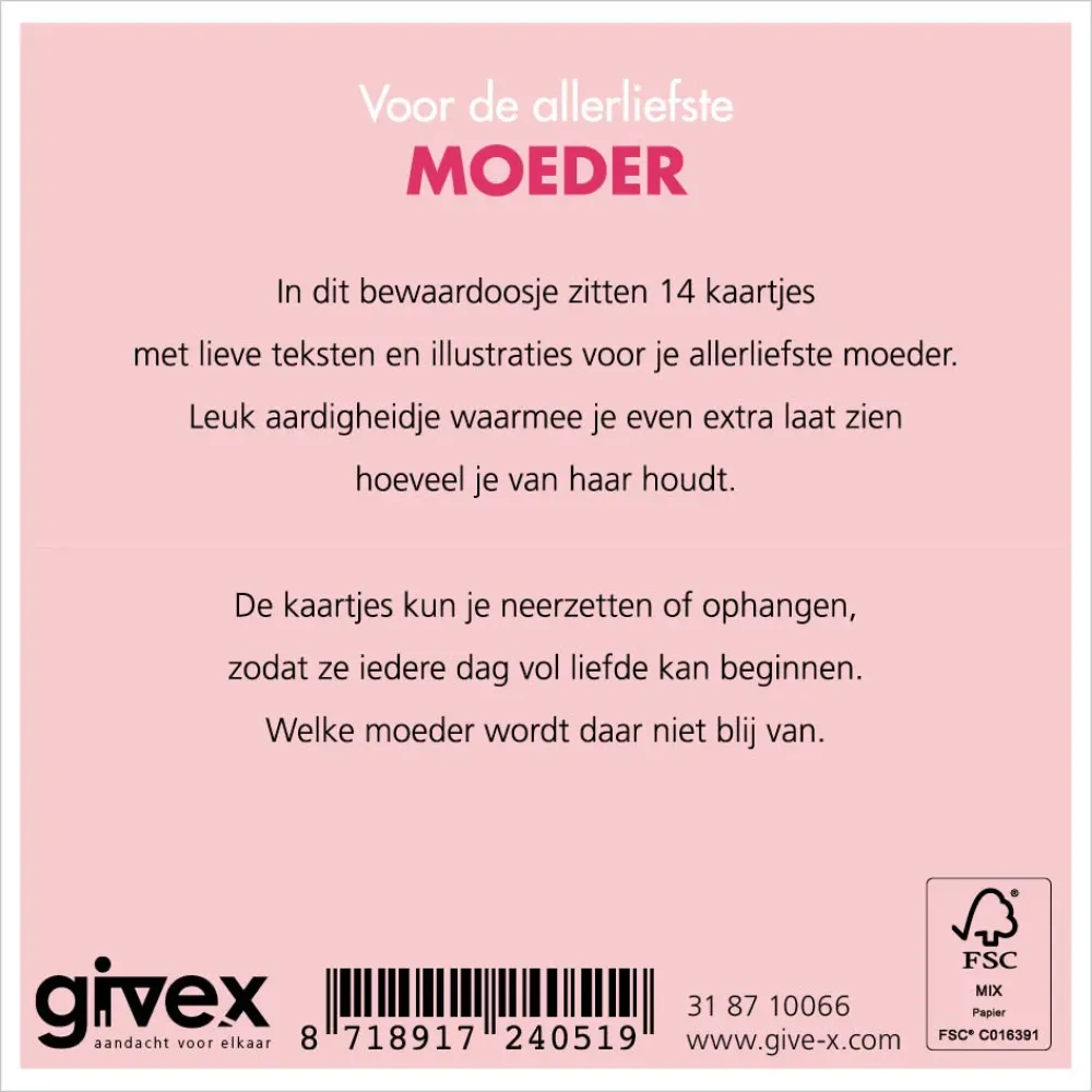 In dit bewaardoosje zitten 14 kaartjes (formaat visitekaartje) met diverse lieve, leuke tekstjes en illustraties voor de allerliefste moeder.