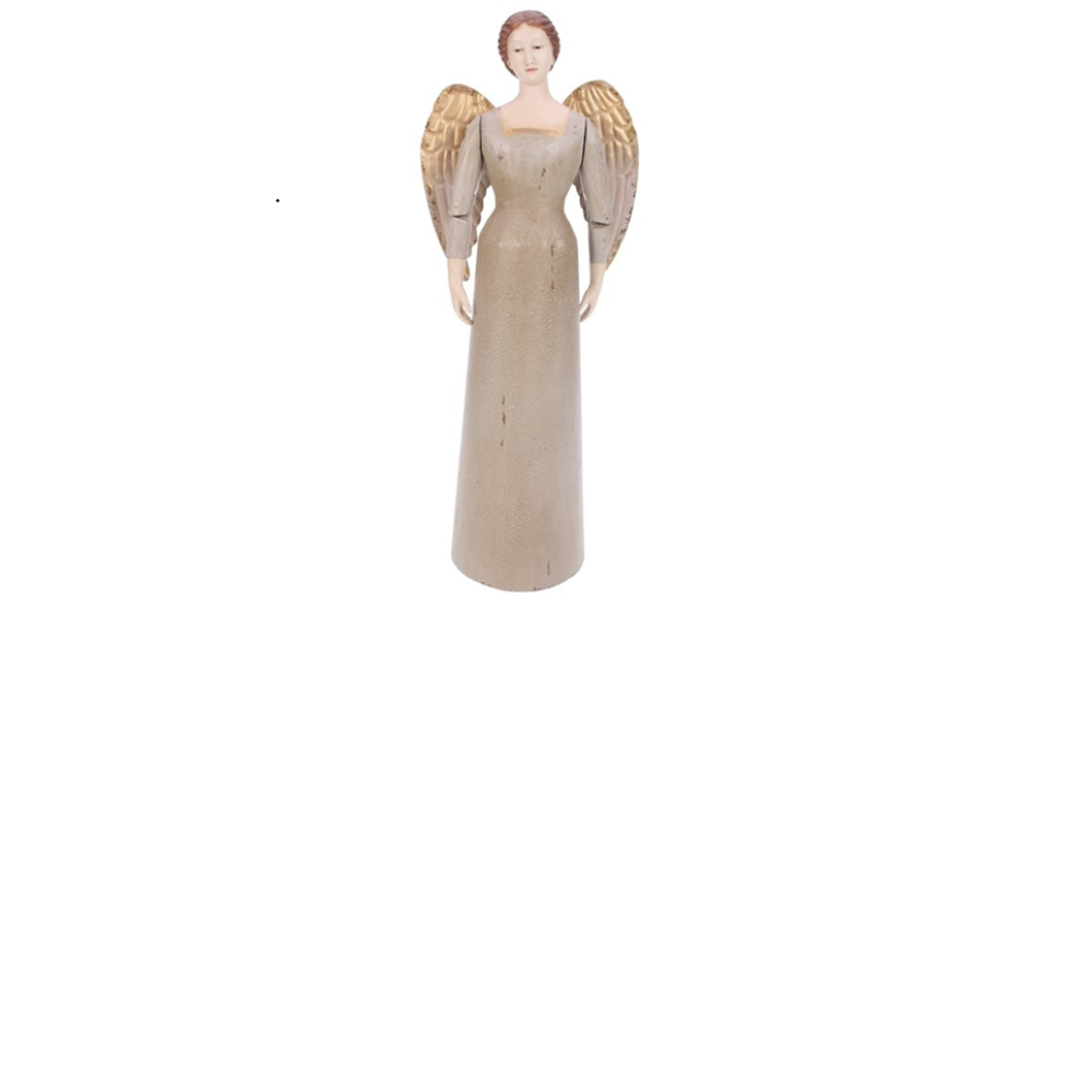 Een prachtige engel gemaakt van polystyreen met een uitstraling van hout. De engel heeft een prachtige antiek groene kleur met goudkleurige details.
