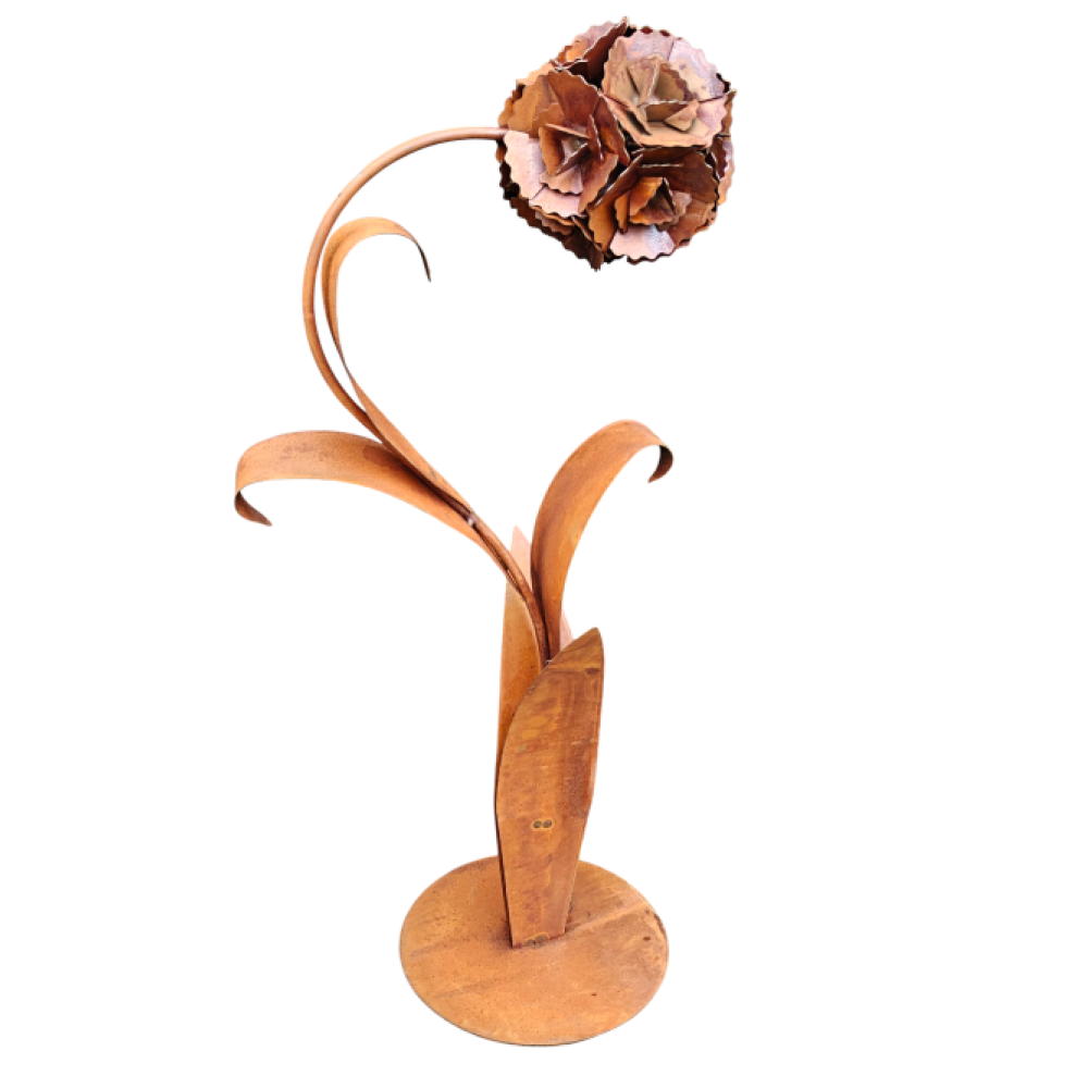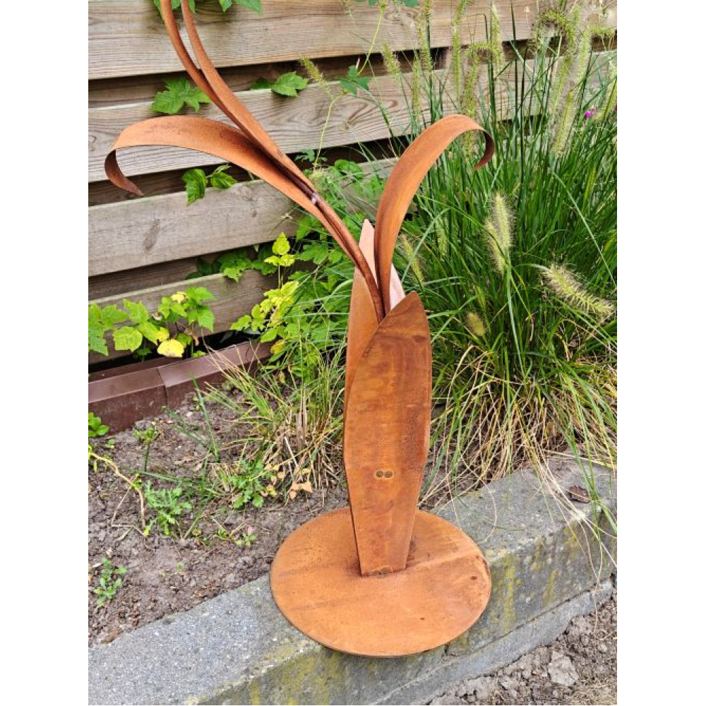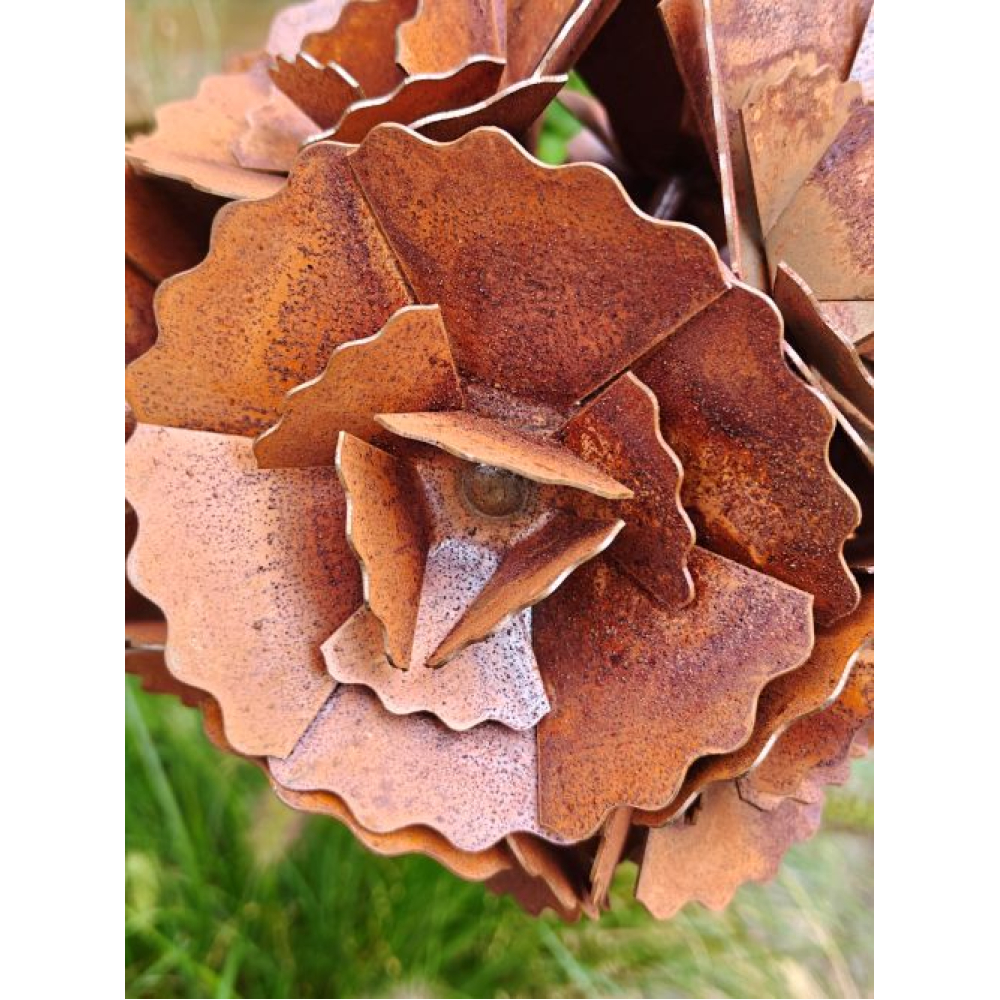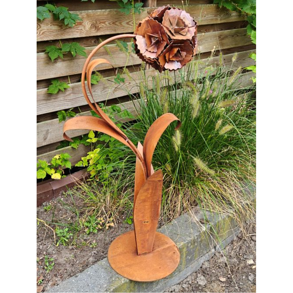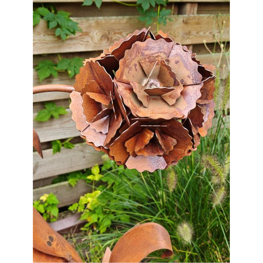 Een gebogen roos gemaakt van ecoroest / cortenstaal, werkelijk een sieraad voor iedere tuin.