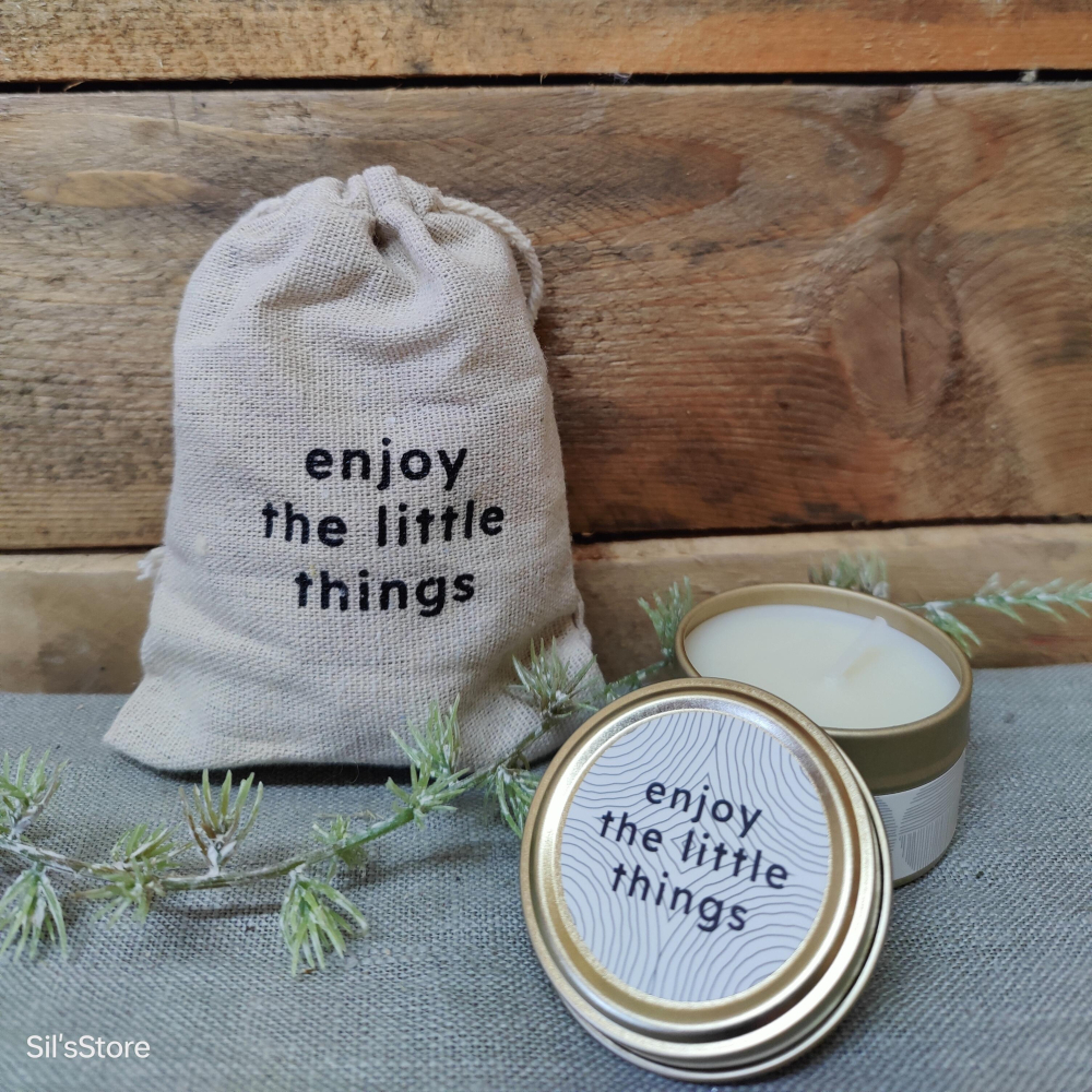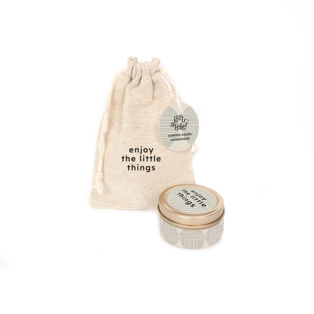 Dit kaarsje in blik met de geur van sandelwood is verpakt in een klein katoenen zakje met hierop de woorden "enjoy the little things" is leuk om weg te geven.