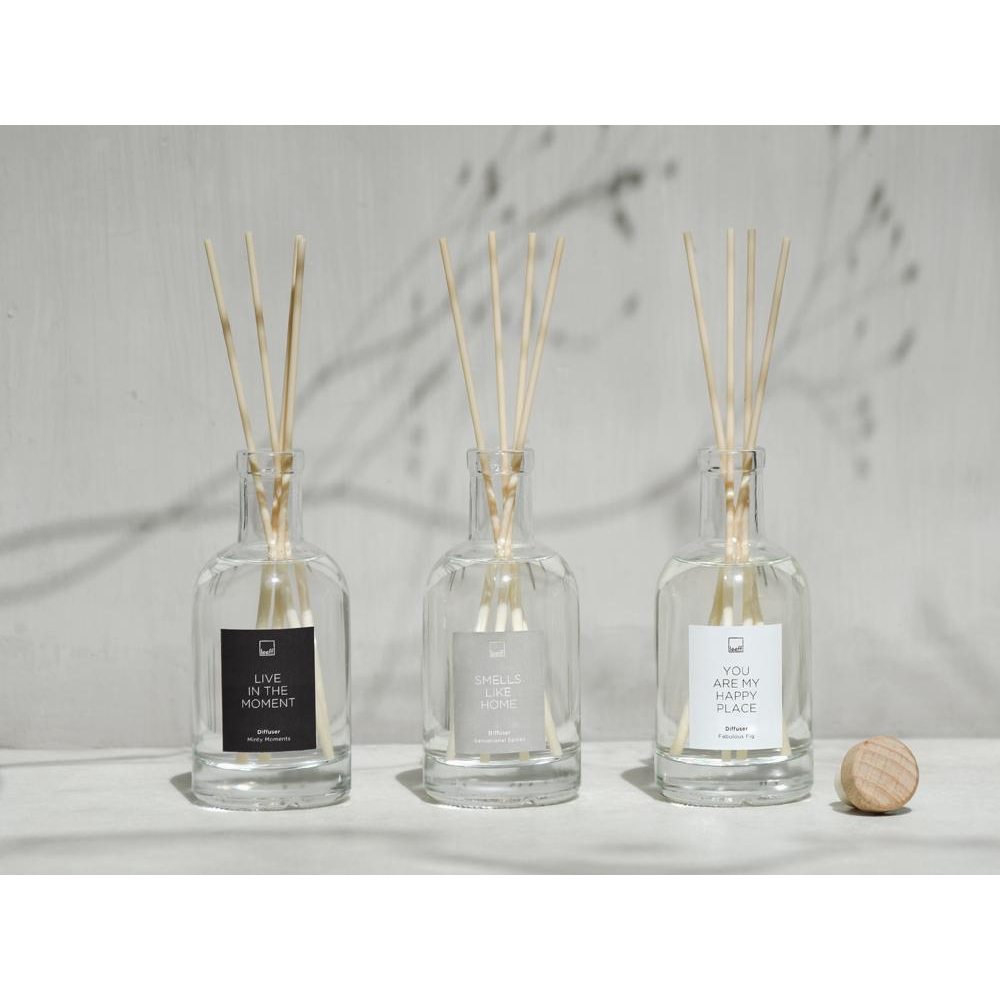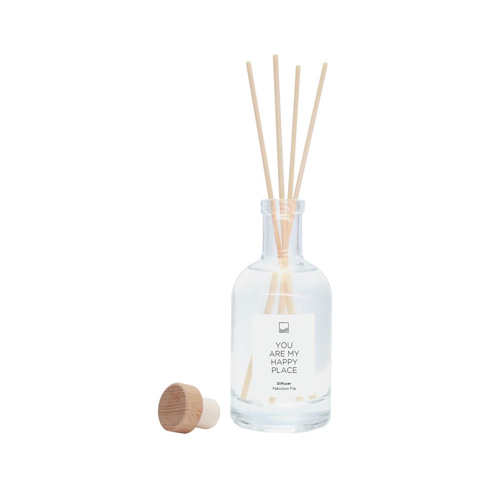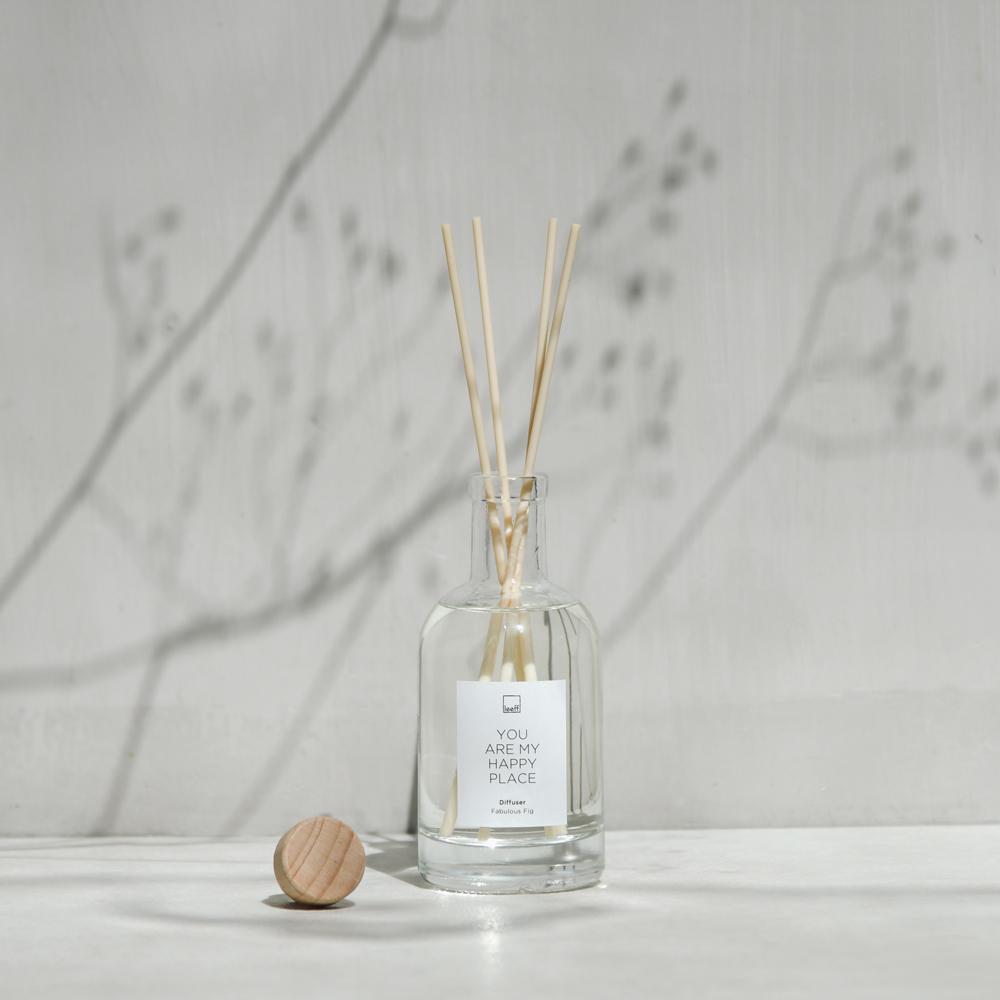 Een diffuser giftset van Leeff met de geur van fabulous fig. Een prachtige glazen karaf met dop van hout.