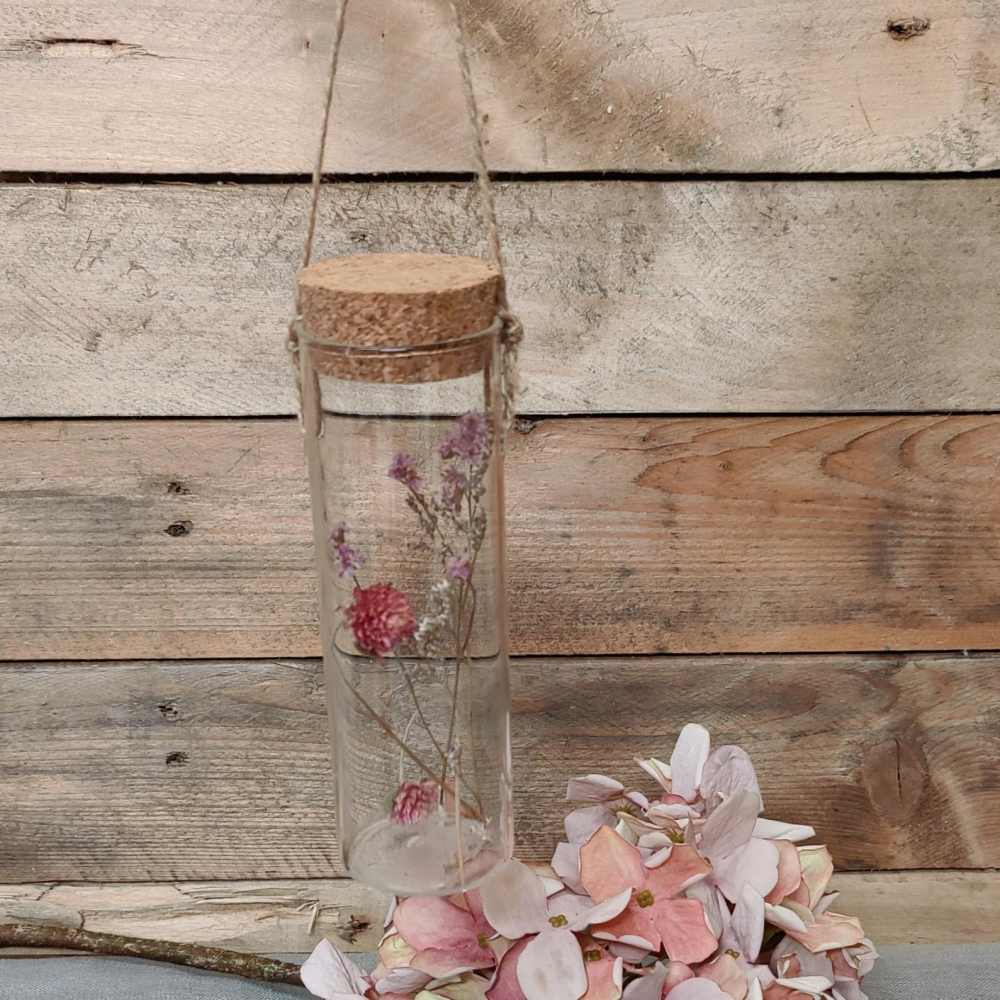 Een glasbuis gevuld met droogbloemetjes welke afgesloten wordt door middel van een dop van kurk.