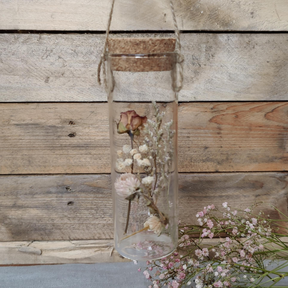 Een glasbuis gevuld met droogbloemetjes welke afgesloten wordt door middel van een dop van kurk.