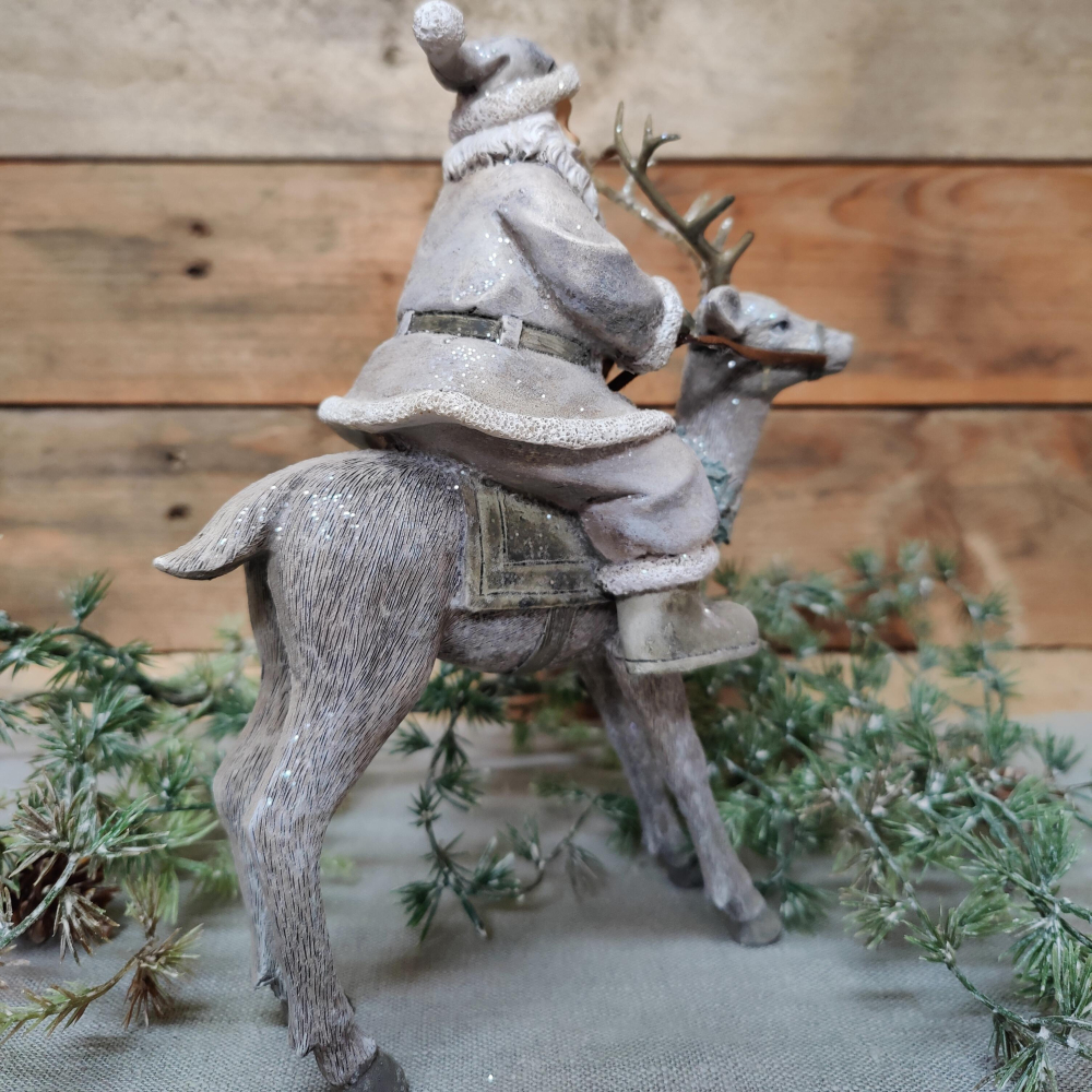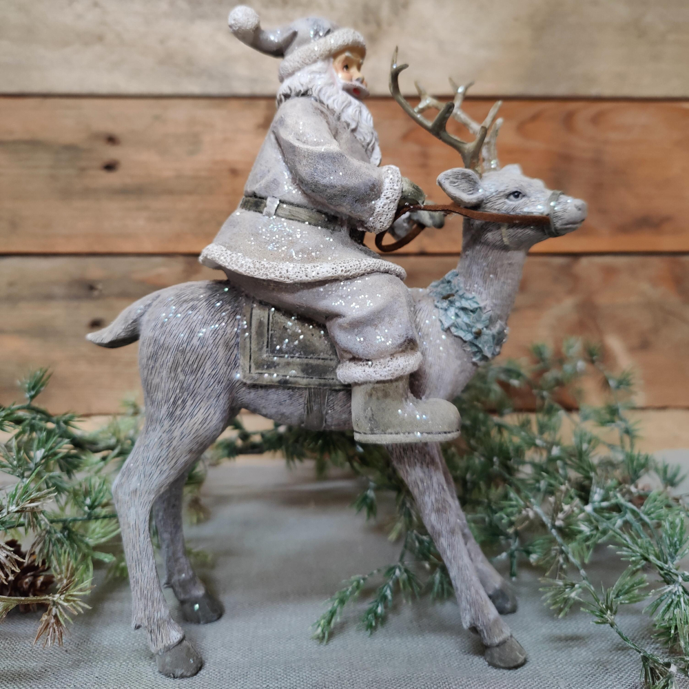 Dit leuke beeldje van een kerstman op een hert voegt sfeer aan je interieur toe! Het beeldje heeft hier en daar wat zilverkleurige glitters wat het beeldje een luxere uitstraling geeft.
