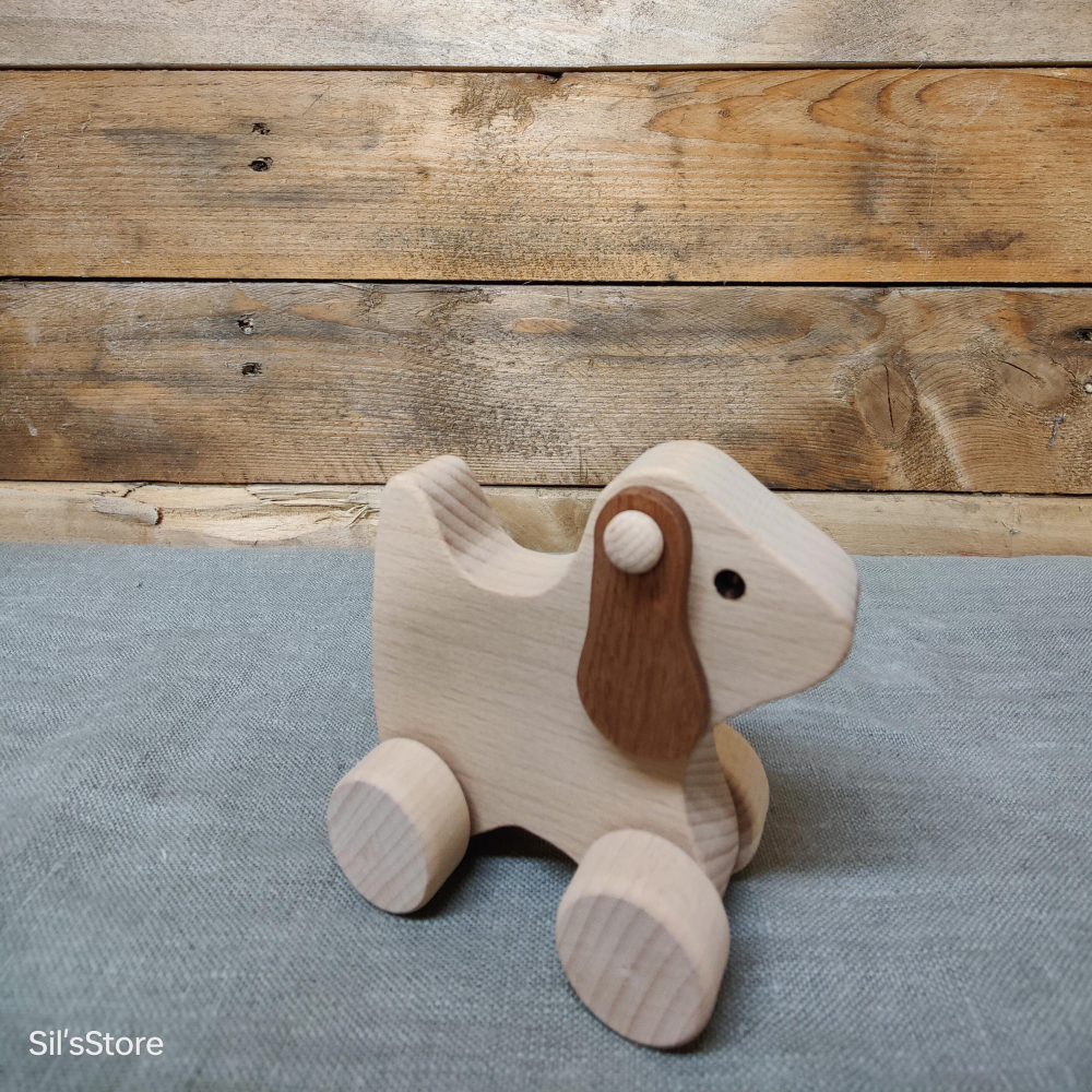 Mooi Europees beukenhouten hondje met bewegende oren op bewegende wielen.