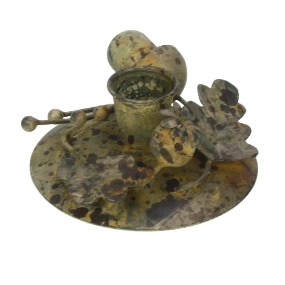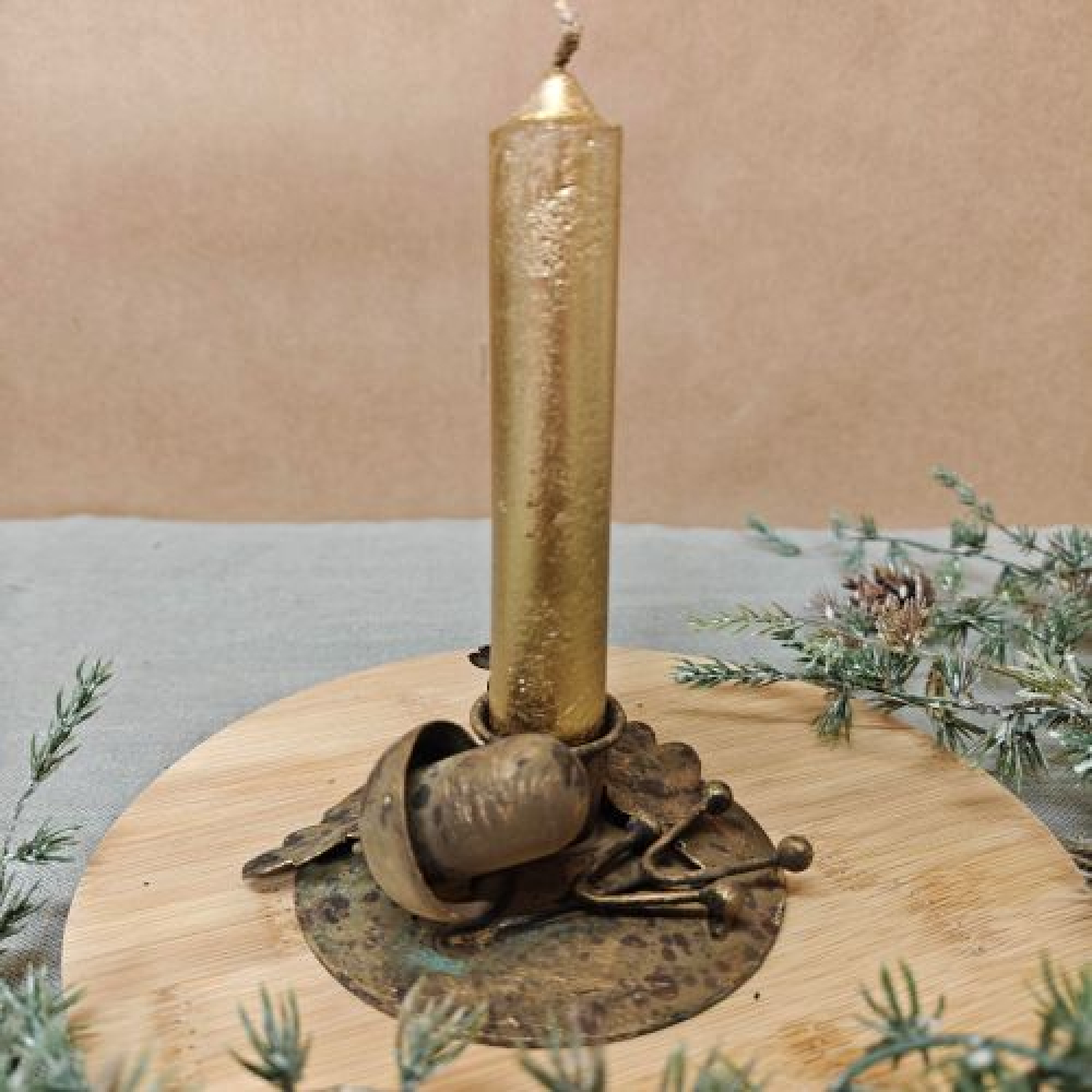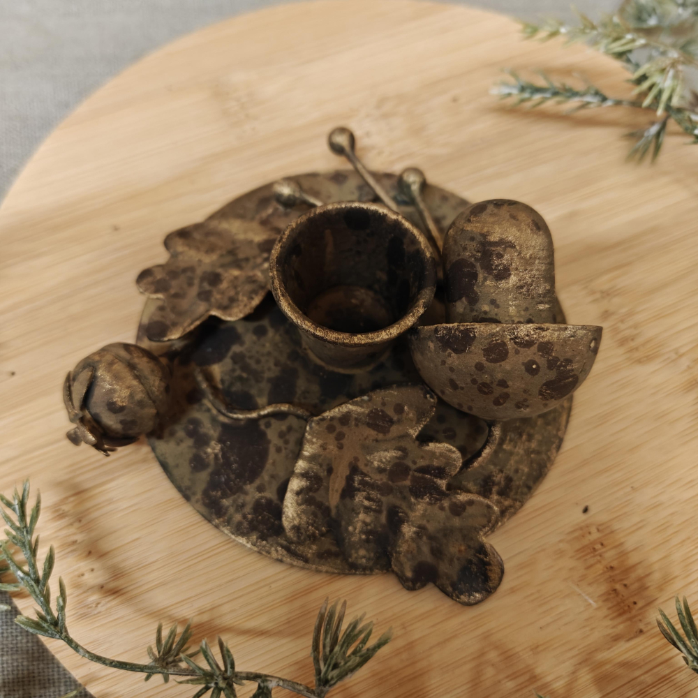 Een kleine kandelaar gemaakt van metaal in een antiek goudkleur. De kandelaar is gedecoreerd met verschillende bladeren.