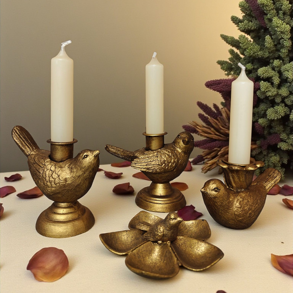 Geef je interieur een stijlvol accent met deze goudkleurige kandelaar op voet, versierd met een sierlijke vogel die naar rechts kijkt. Het verfijnde ontwerp en de warme glans zorgen voor een decoratief stuk dat zowel solo als in een set mooi tot zijn recht komt.