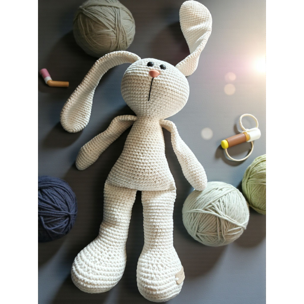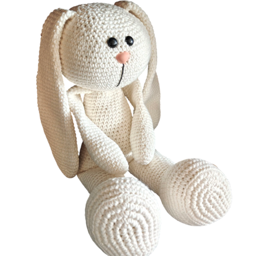Het konijn is circa 40 cm groot en heeft een tijdloze, natuurlijke uitstraling die past in elk interieur. Dankzij het gebruik van katoengaren voelt het konijn heerlijk zacht aan en is het veilig om mee te knuffelen. Elk exemplaar is uniek, met kleine variaties die getuigen van echt handwerk.