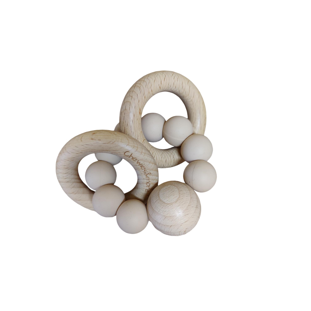 * een rammelaar / bijtring van het merk "Chewies" gemaakt van gecertificeerd hout