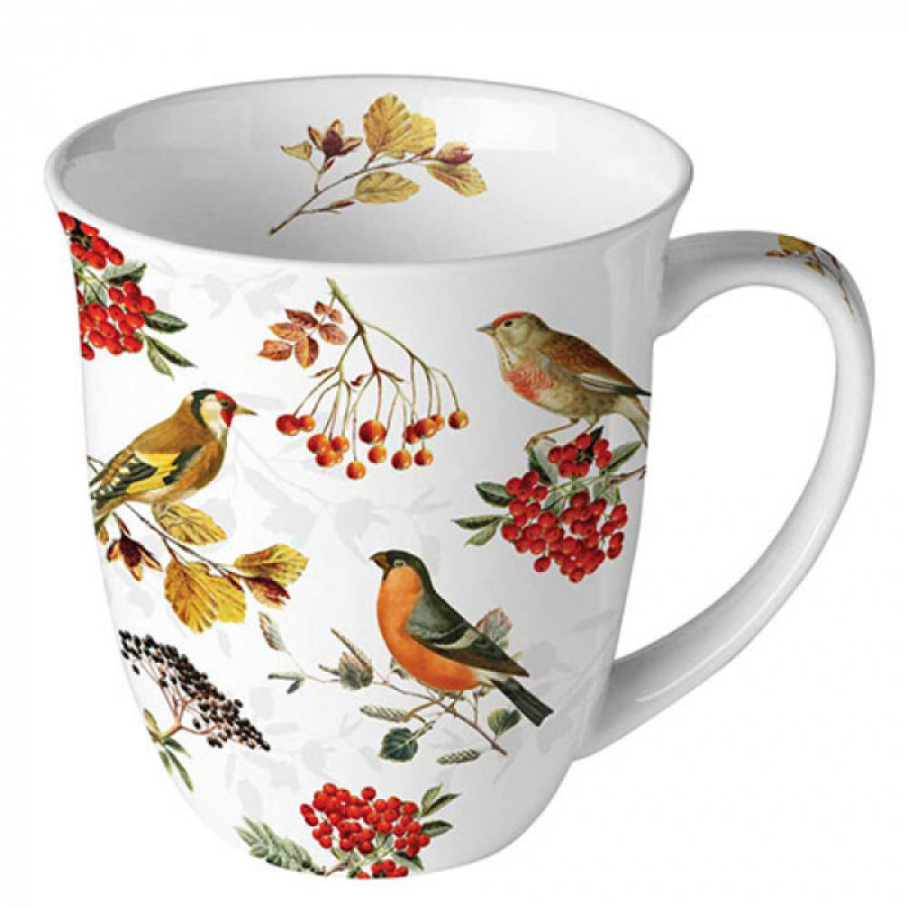 Een mooie porseleinen mok met oor van het merk Ambiente met de afbeelding van diverse vogels in de herfst.