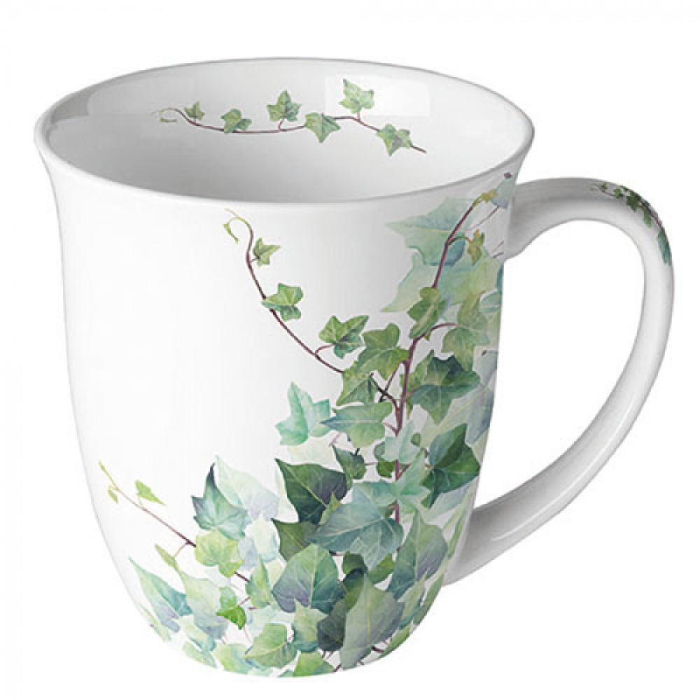 Versierde mok met hederabladeren en deze is gemaakt van porselein.