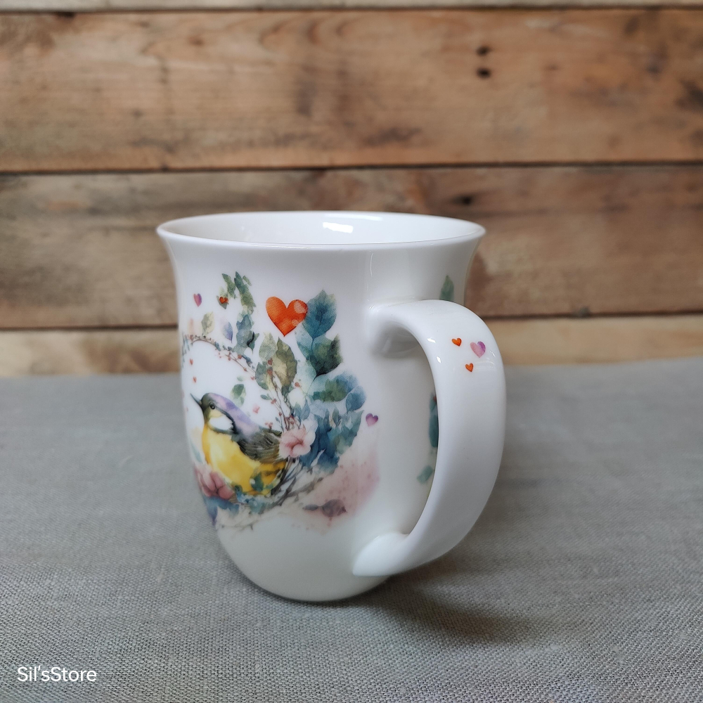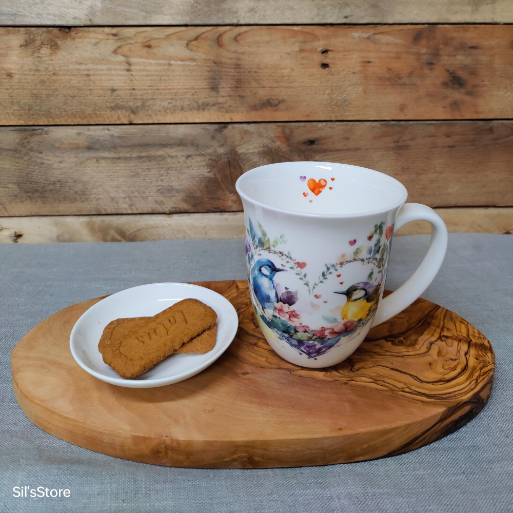 Prachtige beker met een print van verliefde vogels. De mok is gemaakt van hoogwaardig porselein en komt uit de serie 'loving birds' van Ambiente.