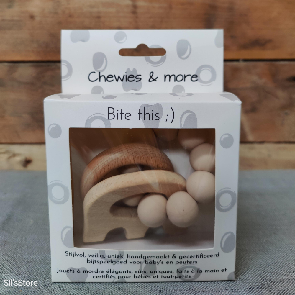 De ring en het olifantfiguur om de siliconen kralen heen maken een rustgevend rammelend geluid.