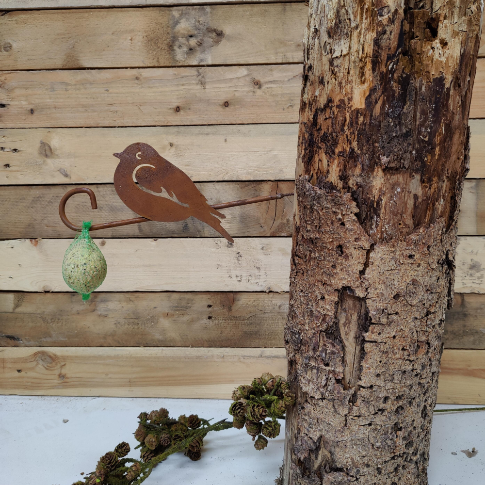 Hang een vetbol eens op een leuke manier in je tuin. De voederhaak is  gemaakt van eco-roest, dit betekent dat het ijzer behandeld is waardoor het roestproces eerder in gang is gezet om het metaal een warme uitstraling te geven. En wat mooi is is dat het een natuurlijke grondstof is en hierdoor100% recyclebaar.
