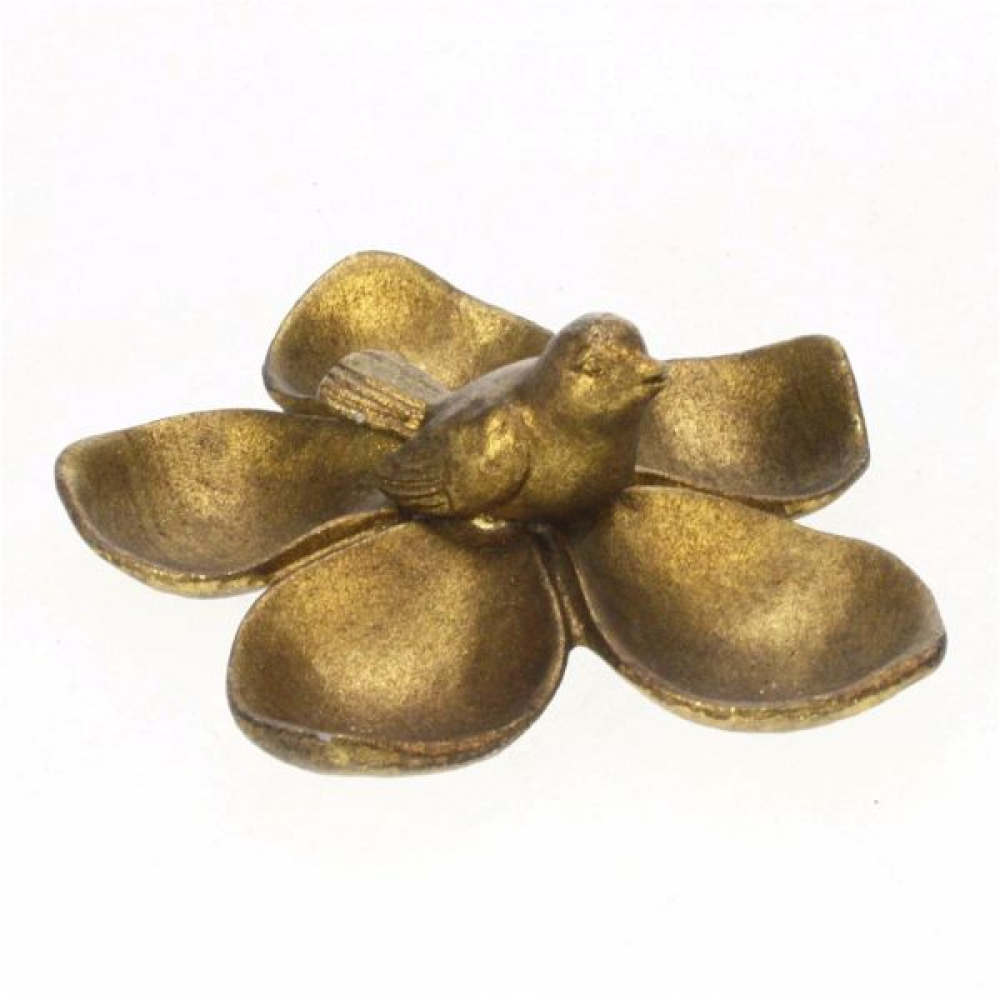 Een mooi goudkleurig schaaltje in de vorm van een bloem met hierop een vogel. Het schaaltje is van het mooie merk Meander.