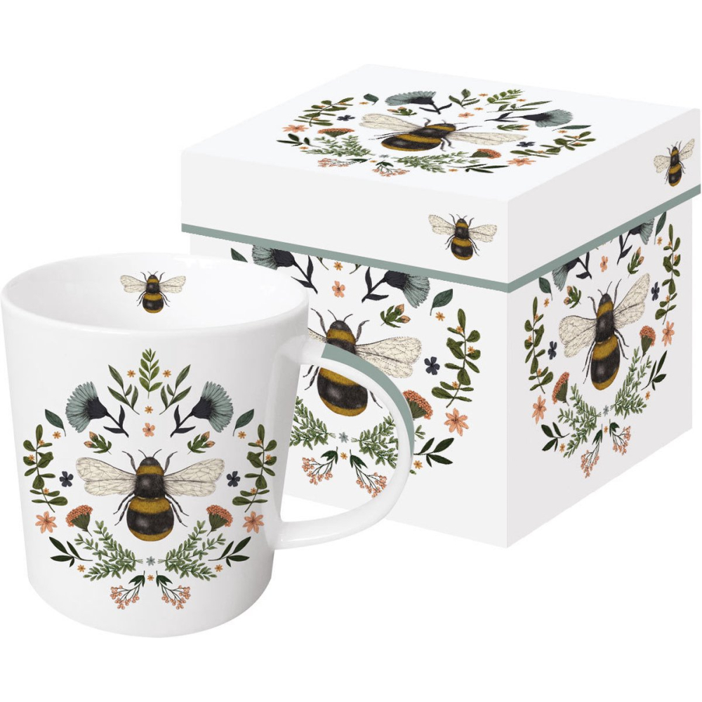 Grote gedecoreerde mok van mooi porselein in een bijpassende rechthoekige geschenkdoos.
