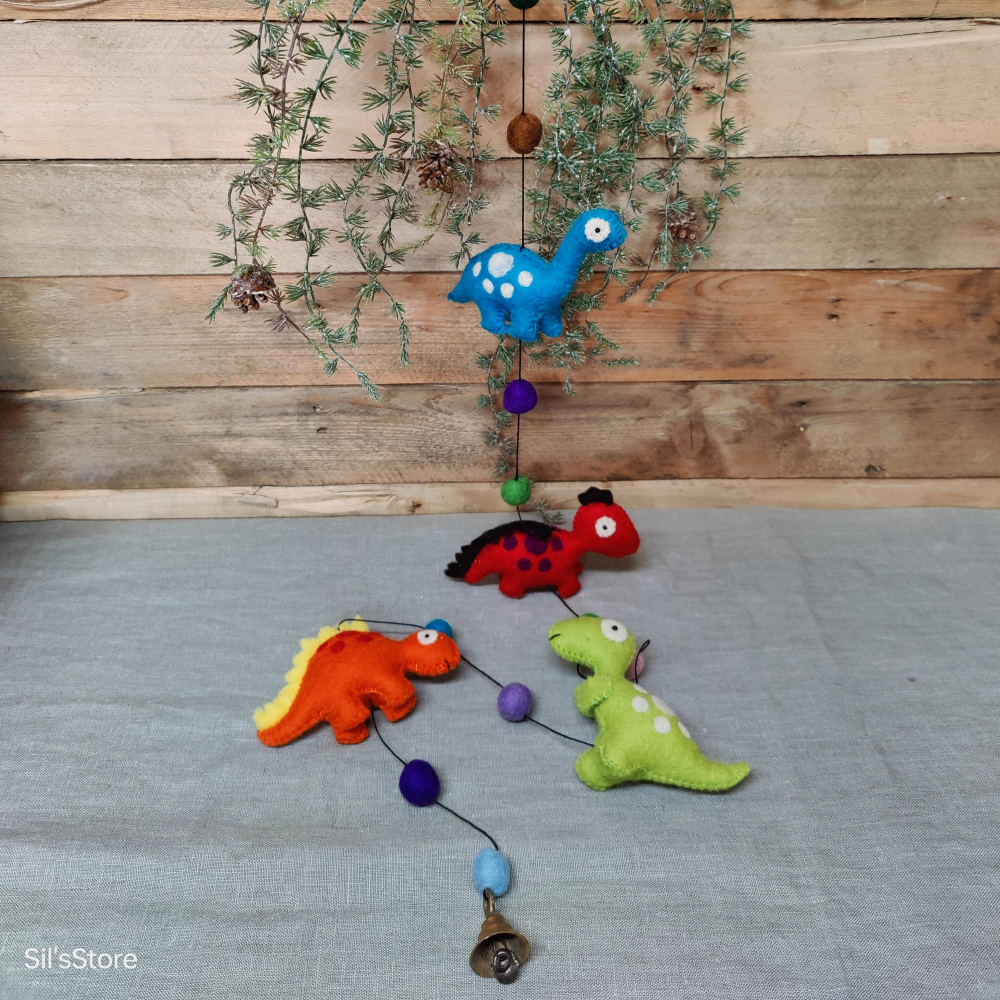 Vilten slinger met diverse dino's in vrolijke kleuren, onderaan hangt een belletje. Heel leuk voor in de kinderkamer, maar ook als decoratie in elk interieur!