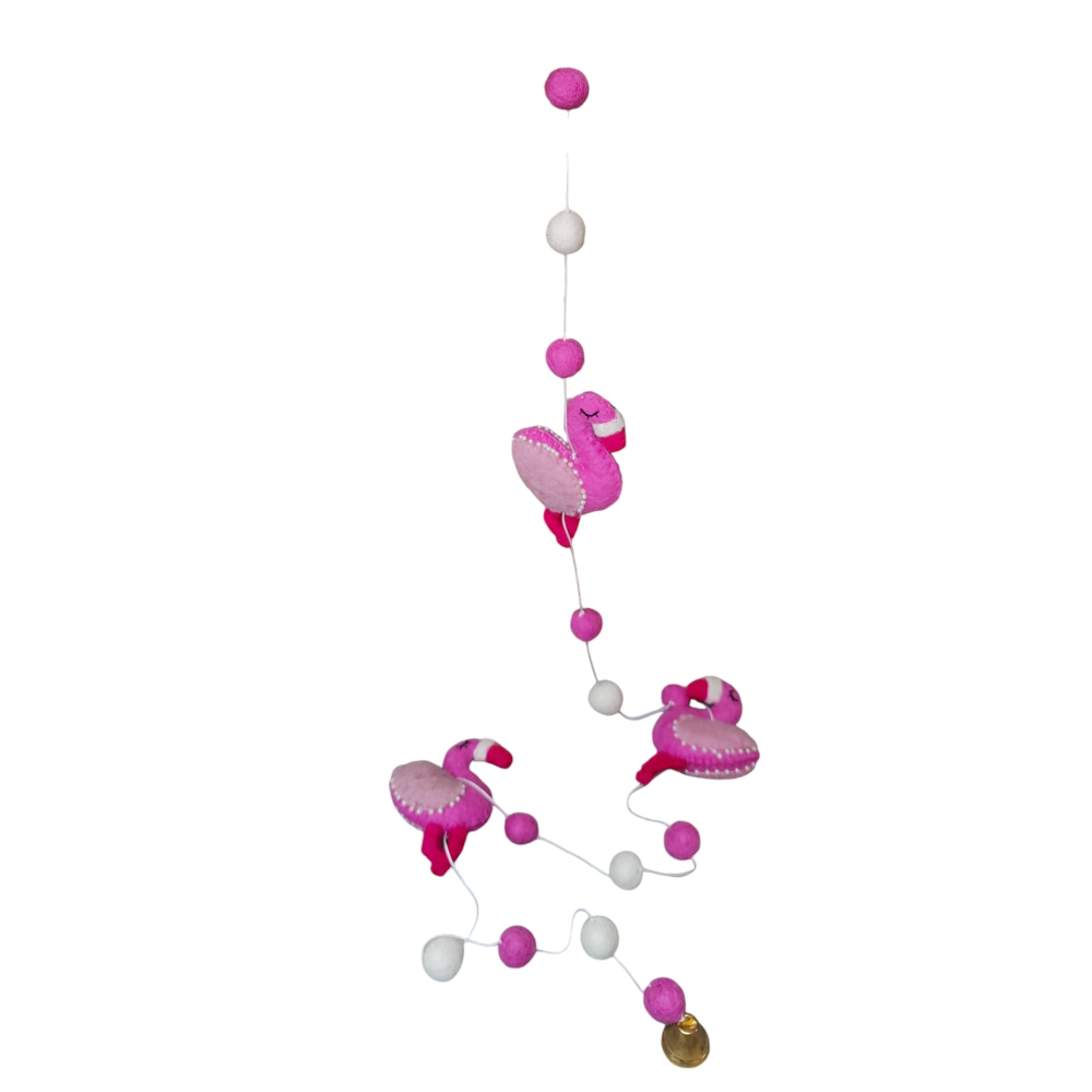 Vilten slinger met diverse flamingo's in vrolijke roze kleuren, onderaan hangt een belletje. Heel leuk voor in de kinderkamer, maar ook als decoratie in elk interieur!