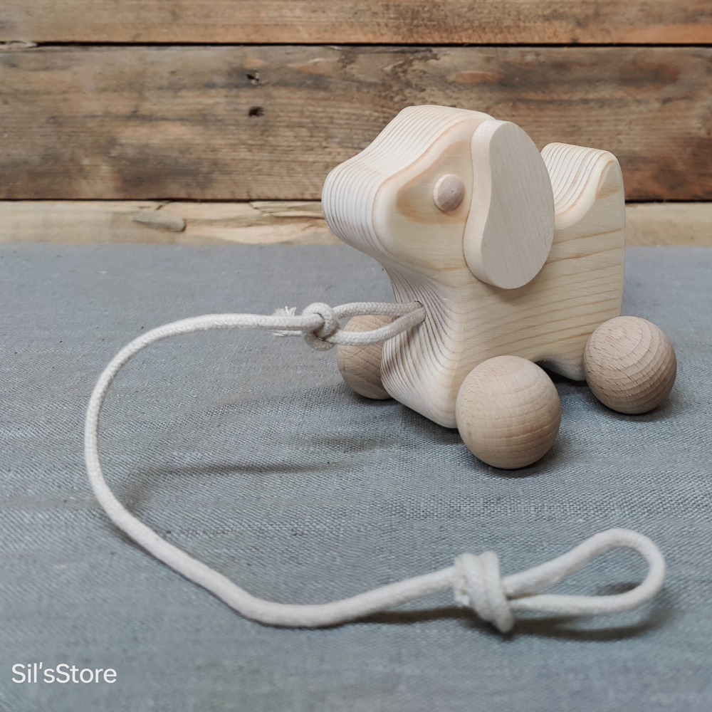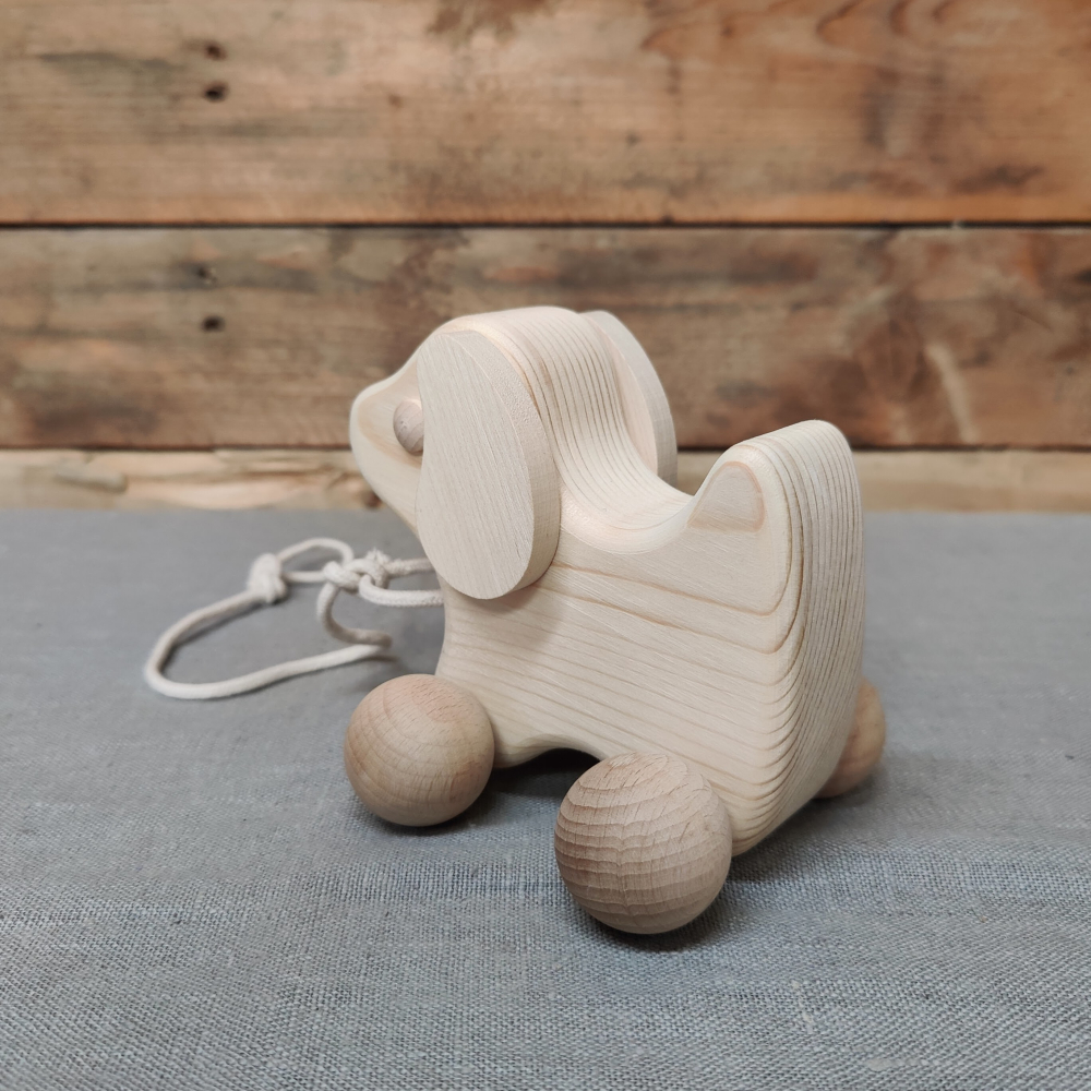 Handgemaakte trekhond van beukenhout met draaiende wielen en voorzien van trekkoord, gemaakt van naturel katoen touw.
